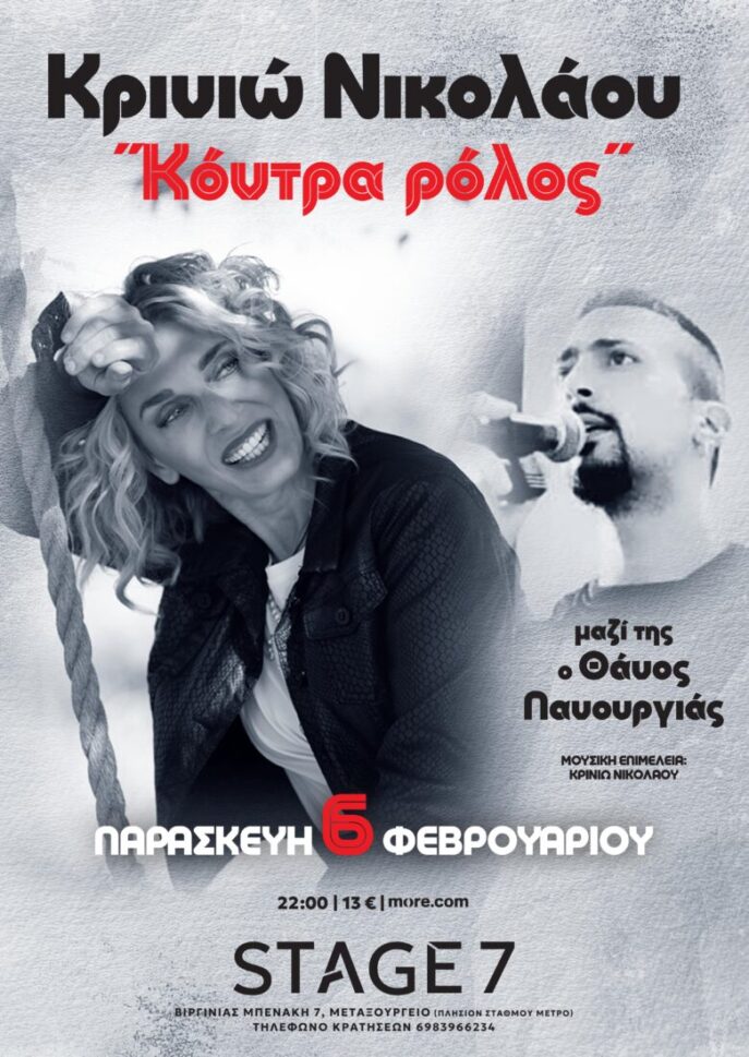 Η Κρινιώ Νικολάου έρχεται στη σκηνή του Stage 7 με την παράσταση «Κόντρα ρόλος», ένα μουσικοθεατρικό ταξίδι γεμάτο χιούμορ, συγκίνηση και ανατροπές. Μαζί της, σε έναν απρόσμενο καλλιτεχνικό διάλογο, ο νέος ερμηνευτής και πολλά υποσχόμενος Θάνος Πανουργιάς.