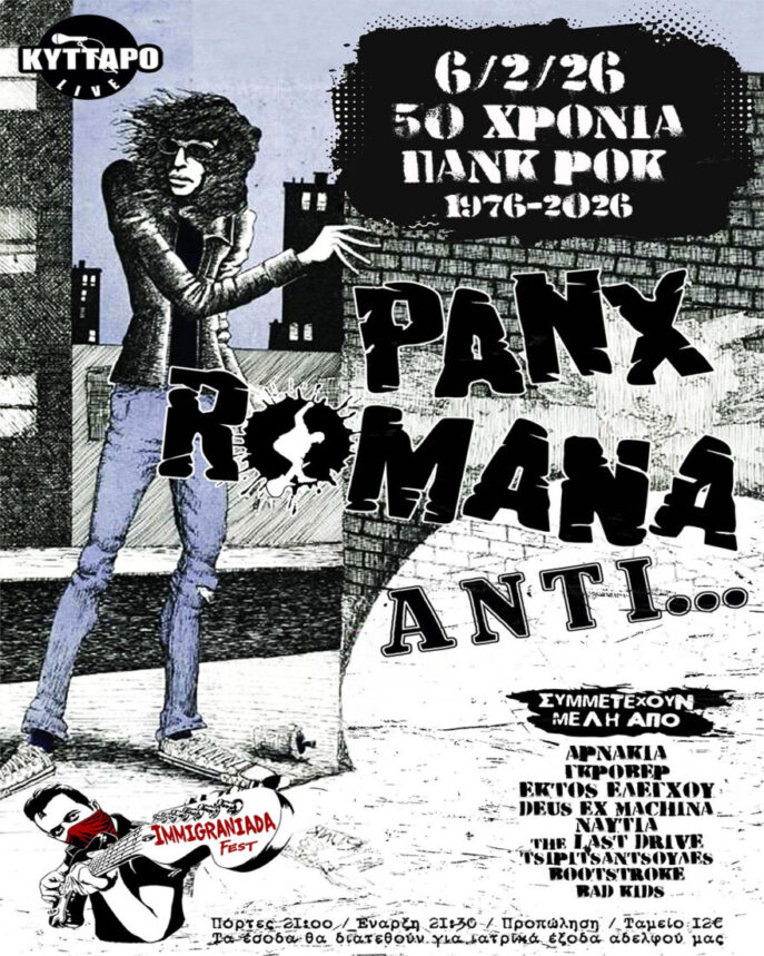 Το 12o Immigraniada Festival και οι Panx Romana, με αφορμή την μεγάλη επέτειο του πανκ, από το σωτήριον έτος 1976, μας χαρίζουν μία εκρηκτική βραδιά. Ο σκοπός είναι πάντα αλληλέγγυος και μια μεγάλη μουσική αγκαλιά με πολλούς καλεσμένους που μαζί με τους Panx Romana θα παρουσιάσουν ένα θέαμα φωτιά.
