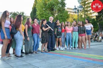Μπροστά σε ένα ιδιαίτερο και πρωτόγνωρο για τα ελληνικά δεδομένα σκηνικό, είχαν την τύχη να βρεθούν οι περαστικοί από την πλατεία Συντάγματος την Τετάρτη το απόγευμα. Μέσα από το πλήθος εμφανίστηκε ξαφνικά ο Διονύσης Σαββόπουλος και τραγούδησε παρέα με τη Μαρίνα Σάττι, τις Fonés και τις Chόres!